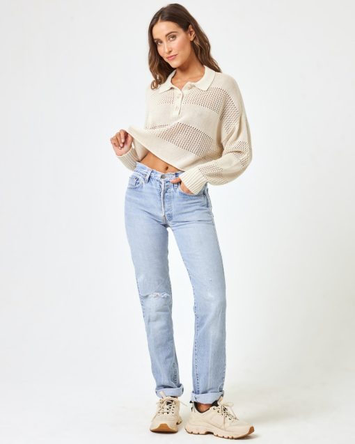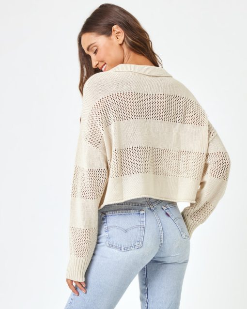 The Rugby Sweater is as versatile as it gets. Throw it on over your bikini or pair it with pants for a pulled-together vibe. This crochet paneled pullover has a collar, 1/4 button down and ribbed cuffs at the sleeves. It’s now available in the most beautiful, neutral shade of bone. Collared Long Sleeve Crochet Paneling Quarter Button Down 100% Cotton Style # ARUGSW24