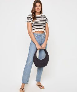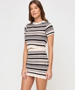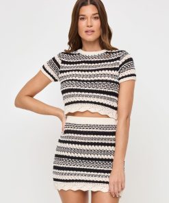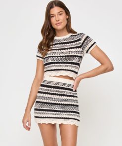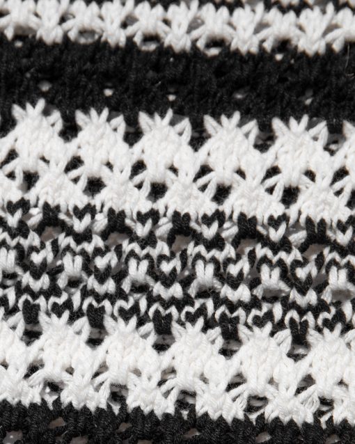 You can never have too much crochet in your closet! The Caicos Top is an intricate and special piece that can be worn as a matching set or paired with denim for a beach-to-street look. This crop top has a scalloped hem, short sleeve and the monochrome palette is complemented by our sweater knit crochet fabric. Crop TopShort SleeveScalloped HemSweater Knit XS-XL 100% Cotton