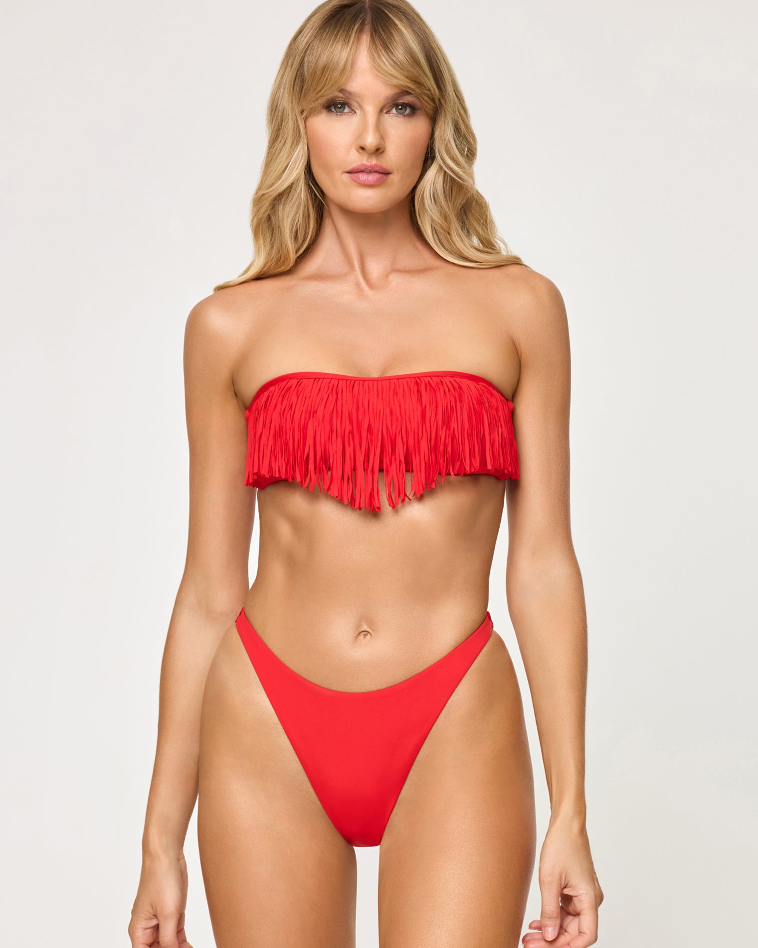 The Dixie Top is a strapless bandeau bringing sexy back thanks to its nostalgic fringe at the bust. You’ll be able to shimmy and shake in this iconic bikini that features removable pads and back tie. Bandeau Top Tie at back Fringe at bust Removable Padding Size XS-XL 82% Polyester | 18% Spandex Style # LSDIT25