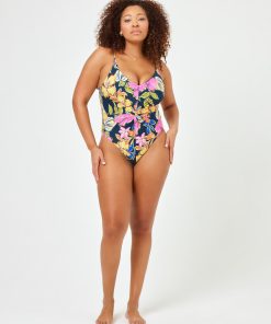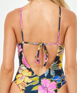 The Devi One Piece is our classic coverage style that takes things to the edge with its deep-v neckline. Our new TPD print adds to the elegance and molded cups along with a twist at the waist make this the perfect suit to lounge in the sun or chase after the kids on the beach! Classic Coverage Adjustable Straps Tie At Back Twist At Waist Molded Cups Size XS-XL 80% Nylon/ 20% Spandex Like all delicates, shape, color and fit are best preserved if hand washed in cold water. Lay flat to dry. Style # LSDVMC24PE