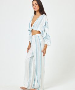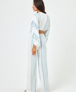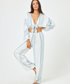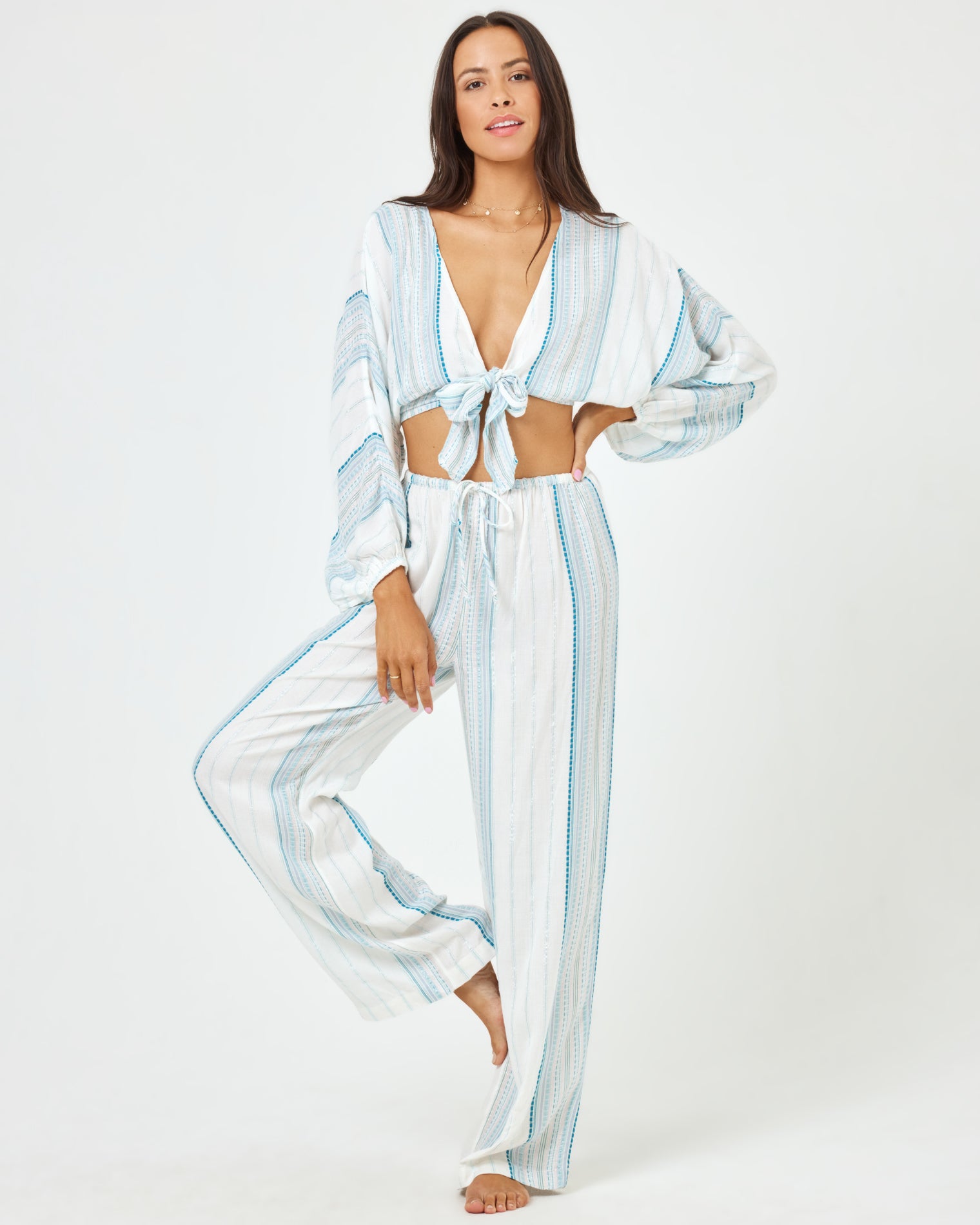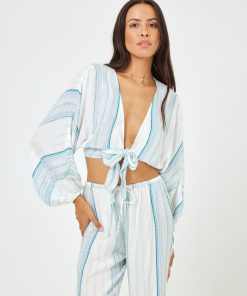 You can never have too many crop tops in your closet! The Reese is a head-turner with our Magic Hours metallic yarn-dye striped fabric, tie front + long bell sleeves. Create a set with the matching shorts or wear it with denim to switch things up.Long Belle Sleeve With Elastic Cuff Wrap Tie At Front V Neckline, Cropped Magic Hours Metallic Yarn Dye Stripe Tie Front Crop Top Size XS-XL 99% Viscose 1% Metallic Style # REETP23 Model Measurements: Emily, size S – Height 5’9 1/2, Bust 34″, Waist 25″, Hips 35″