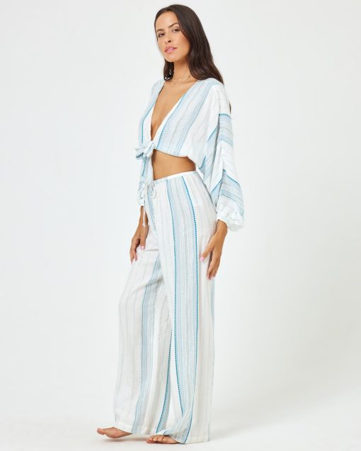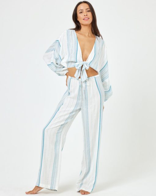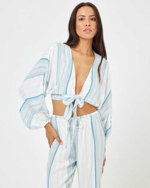 You can never have too many crop tops in your closet! The Reese is a head-turner with our Magic Hours metallic yarn-dye striped fabric, tie front + long bell sleeves. Create a set with the matching shorts or wear it with denim to switch things up.Long Belle Sleeve With Elastic Cuff Wrap Tie At Front V Neckline, Cropped Magic Hours Metallic Yarn Dye Stripe Tie Front Crop Top Size XS-XL 99% Viscose 1% Metallic Style # REETP23 Model Measurements: Emily, size S – Height 5’9 1/2, Bust 34″, Waist 25″, Hips 35″