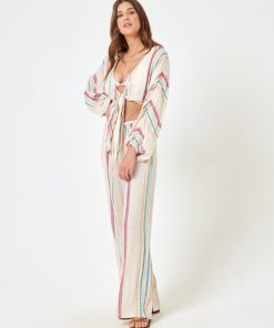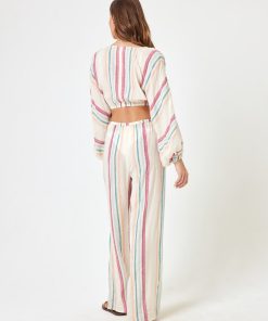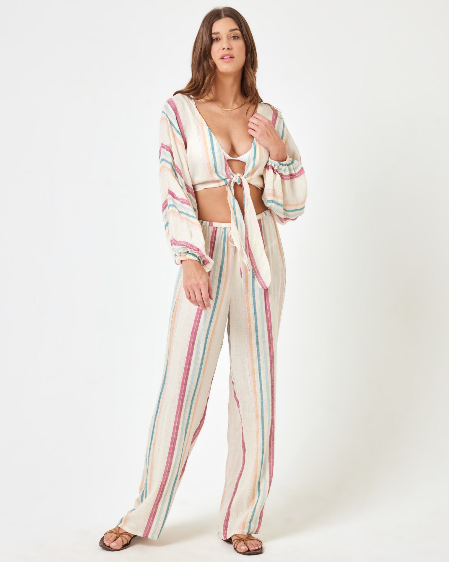 You can never have too many crop tops in your closet! The Reese is a head-turner with our It Comes In Waves metallic yarn-dye striped fabric, tie front + long bell sleeves. Create a set with the matching Lily pant or wear it with denim to switch things up.Long Belle Sleeve With Elastic Cuff Wrap Tie At Front V Neckline, Cropped Magic Hours Metallic Yarn Dye Stripe Tie Front Crop Top Size XS-XL 99% Viscose 1% Metallic Style # REETP23 Model Measurements: Maitlynn, size S – Height 5’9, Bust 34″, Waist 24″, Hips 35″