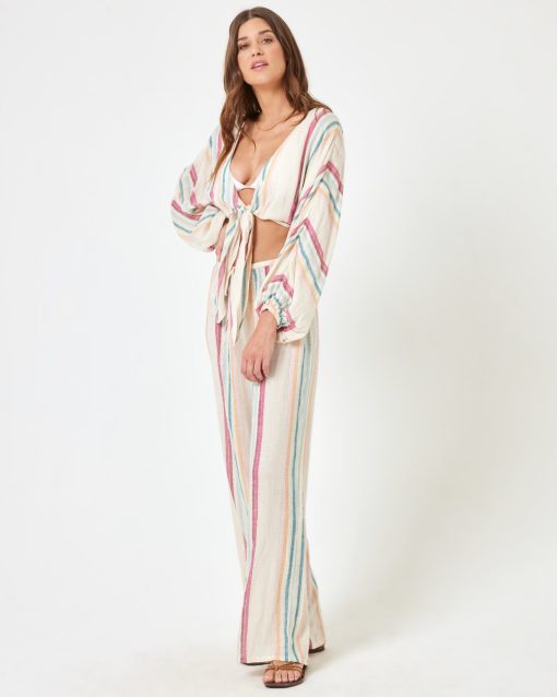You can never have too many crop tops in your closet! The Reese is a head-turner with our It Comes In Waves metallic yarn-dye striped fabric, tie front + long bell sleeves. Create a set with the matching Lily pant or wear it with denim to switch things up.Long Belle Sleeve With Elastic Cuff Wrap Tie At Front V Neckline, Cropped Magic Hours Metallic Yarn Dye Stripe Tie Front Crop Top Size XS-XL 99% Viscose 1% Metallic Style # REETP23 Model Measurements: Maitlynn, size S – Height 5’9, Bust 34″, Waist 24″, Hips 35″