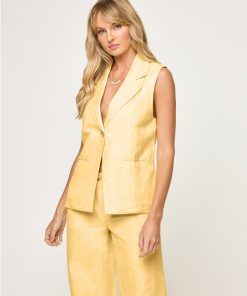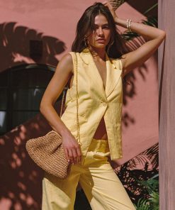 Stack your closet with tailored suiting and just watch as your productivity goes through the roof. Jk, but feeling put together definitely helps meet any goal that comes your way. The San Marco Vest is a sleeveless little number that features a button at mid waist, open bottom, collar and pockets at the front. Pair it with any of the shorts or pants from our new ready-to-wear separates collection. Sleeveless vest Button at mid waist Pockets at front of hips Collared Double breasted 54% Linen, 46% Cotton Style # SNMTP25
