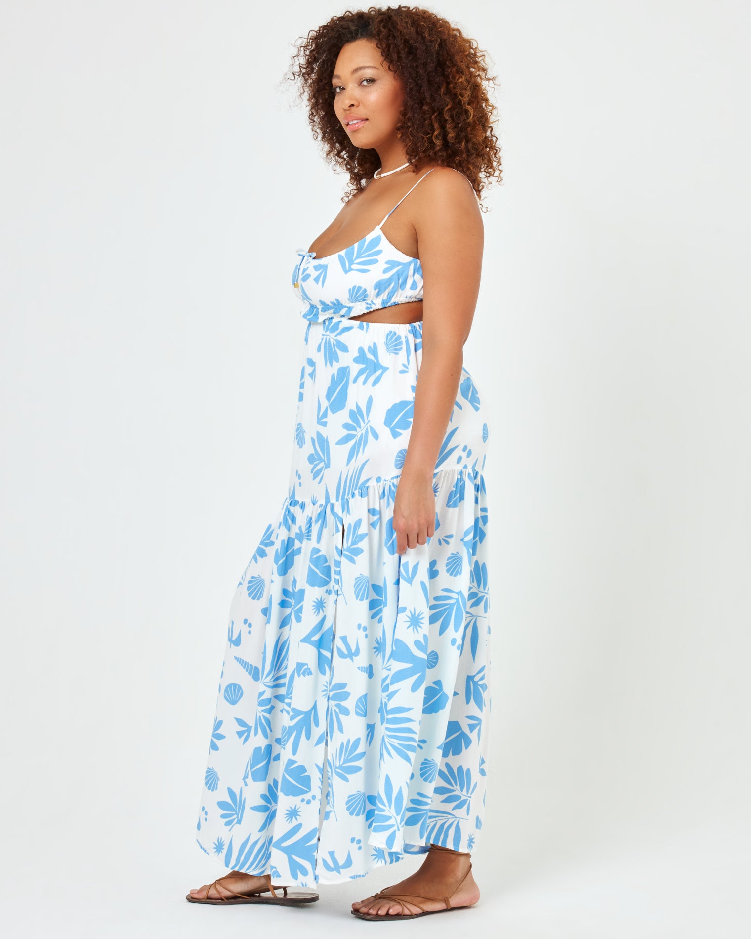 We re-worked our maxi dress silhouette and came up with the Sandra. This printed beauty has an elastic waist with side cutouts and a front tie with bead details. Our gorgeous new blue and white printed linen fabric will make this dress your go-to for your next beach vacay. Tiered Maxi Dress Leg Slit Adjustable Spaghetti Straps Adjustable Tie At Bust Elastic Under Bust Cutout At Waist 100% VISCOSE Like all delicates, shape, color and fit are best preserved if hand washed in cold water. Lay flat to dry. Style # SANDR24