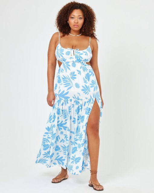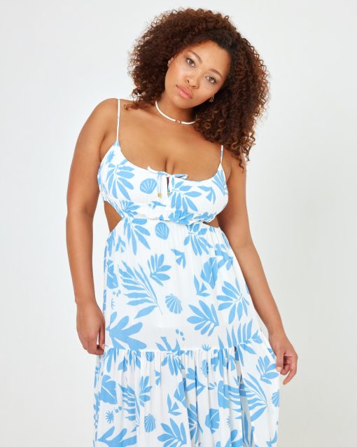 We re-worked our maxi dress silhouette and came up with the Sandra. This printed beauty has an elastic waist with side cutouts and a front tie with bead details. Our gorgeous new blue and white printed linen fabric will make this dress your go-to for your next beach vacay. Tiered Maxi Dress Leg Slit Adjustable Spaghetti Straps Adjustable Tie At Bust Elastic Under Bust Cutout At Waist 100% VISCOSE Like all delicates, shape, color and fit are best preserved if hand washed in cold water. Lay flat to dry. Style # SANDR24