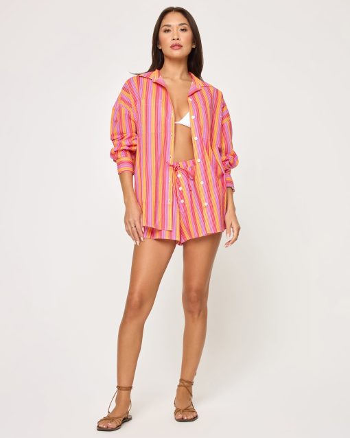 There’s nothing better than a wardrobe workhorse that you can wear multiple ways. The Santa Cruz does all the things and more. This oversized button-down collared shirt has pockets at the breast, button cuffs, and it’s made from a new striped printed poplin fabric. Wear it with the matching Skipper Shorts and you’ll be ready to lounge or get things done — your call.Button down collared shirt Cuffs with buttons, Oversized relaxed fit Pockets at breast Printed poplin Size XS/S, M/L, XL 100% Cotton Style # SANTU25