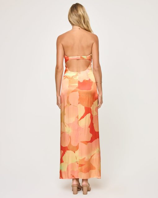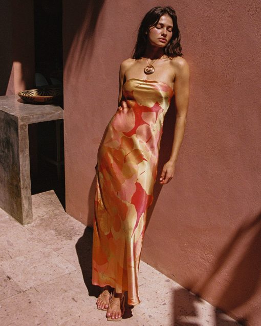 Give your neckline the attention it deserves in the strapless Spring in Love Dress. This midi has a low cut-out and elastic at the back. Our bold floral print adds a layer of sophistication making it perfect for a vacation or weekend getaway. Satin Strapless Ankle Length Dress Low Cutout at Back Elastic at Back Built-in Shelf Bra Size XS-XL Style # SILDR24