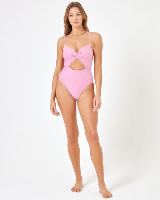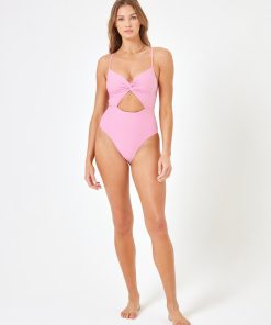 Earth-friendly never looked better than the Kyslee one piece. Part of our “Eco Chic Off the Grid” collection, the fiber in this sexy one-piece is made from 100% recycled materials – using REPREVE® – a high quality performance fiber. No detail was left out in the creation of this beauty with its twist front keyhole in the center, adjustable straps + back, removable pads and classic coverage. Twist Front With Key Hole 3 Point Back Adjustability Adjustable Straps Back Cut Out Removable Pads Eco Ribbed Fabric Size XS-XL 82% Recycled Poly 18% Spandex Lining: 83% Recycled Nylon 17% Lycra (R) Like all delicates, shape, color and fit are best preserved if hand washed in cold water. Lay flat to dry. Style # OGKSMC23A