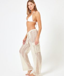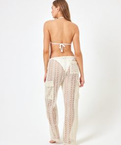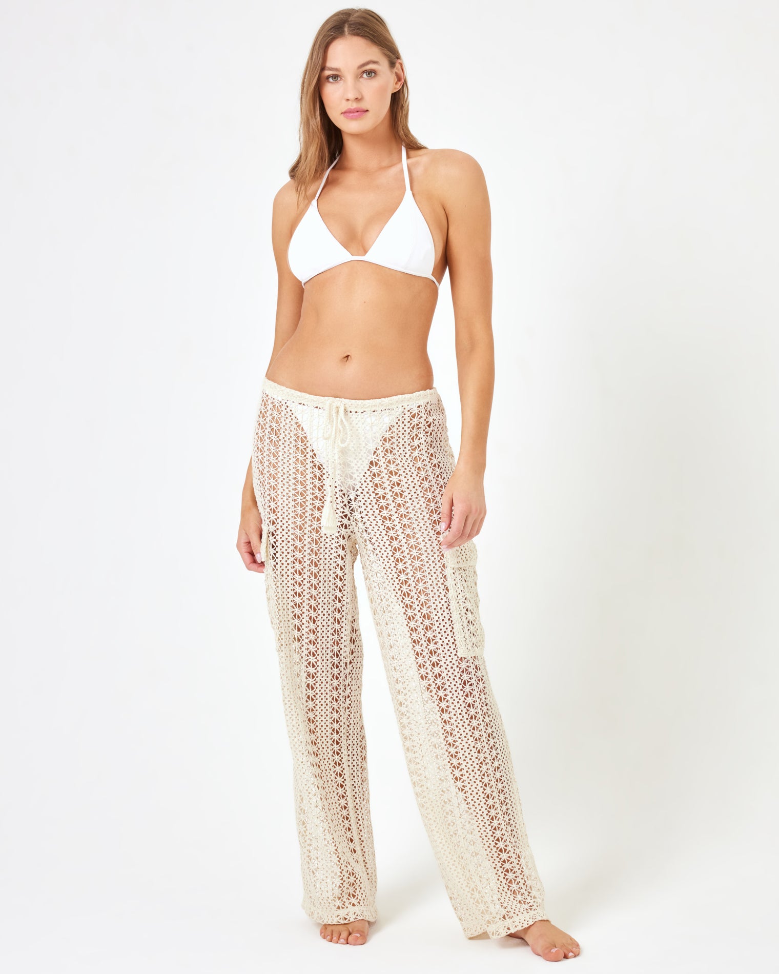 We all love a good cargo and the Sundown Pant is an elevated take on a classic look. Crafted from detailed Ibiza Lace fabric, these have a wide leg that features flap pockets on both thighs, a drawstring waist with tassels that allow you to wear these either high-waisted or low-waisted. Wide Leg Pant Pockets With Pocket Flaps On Both Thighs Drawstring Waist With Tassels Can Wear High Waist Or Low Waist Size XS-XL, 1X-3X 86% Polyester/14% Cotton Style # SNDPT24A Model Measurements: Daria, size S – Height 5’9.5”, Bust 34, Waist 24.5, Hips 36